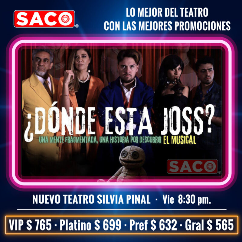 Nuevo Teatro Silvia Pinal (antes Diego Rivera) Versalles 27, Col. Juárez CP 06600, Cuauhtémoc, Ciudad de México. 55 5546 2995 De Martes a domingo de 12:00 a 15:00 y 16:00 a 19:00 horas Cuenta con Valet Parking. Leer más Vista rápida ¿Dónde Esta Joss? Comedia Valorado en 0 de 5 Desde: $565.00